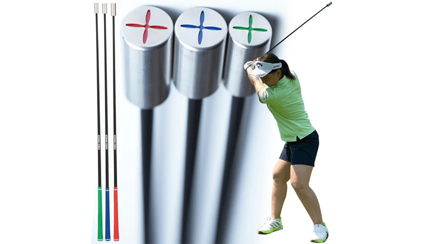 「パワースインガー」は、重さの異なる3本のクラブでスイングスピードと軌道を効率的に鍛えるトレーニング用具です。