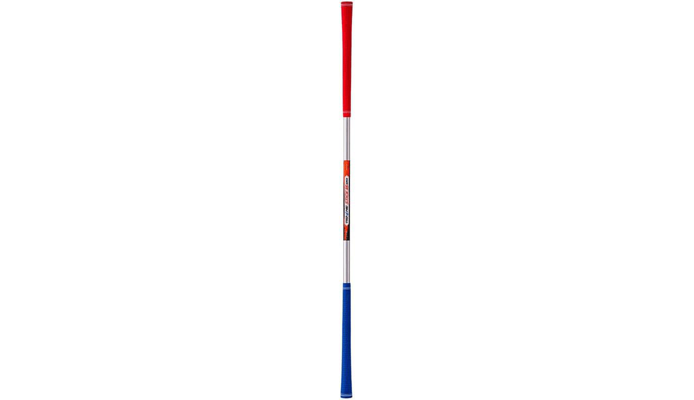 「TRI-ONE スイングスティック35」は35インチ(約89cm)という短さでありながら、約655gという重さがあることが特徴です。両側のグリップはそれぞれ重さの感じ方が違うので、レッドグリップは体幹強化・ブルーグリップはヘッドスピード向上と、目的に合わせて使い分けられます。